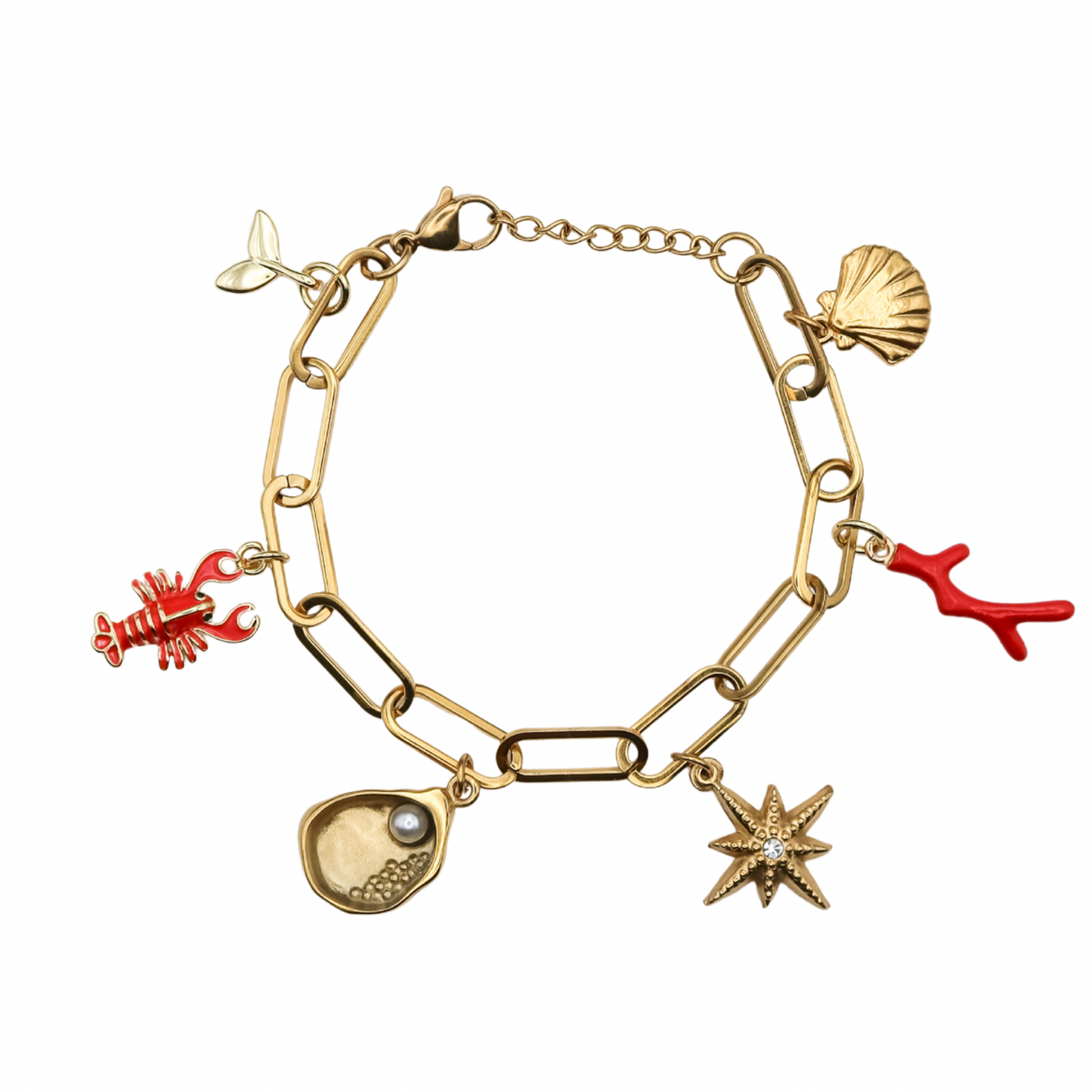 Dive into seaside magic with the Ocean Treasures Charm Bracelet — a bold and beachy piece that brings the spirit of the sea to your wrist. Crafted from 6.5mm 18K Gold PVD-coated stainless steel paperclip chain, this bracelet measures 6.5" with a 1" extender and features a curated collection of ocean-inspired charms: a shimmering mermaid tail, vibrant red lobster, elegant oyster with pearl, textured compass star, bold red coral, and a delicate mini shell.