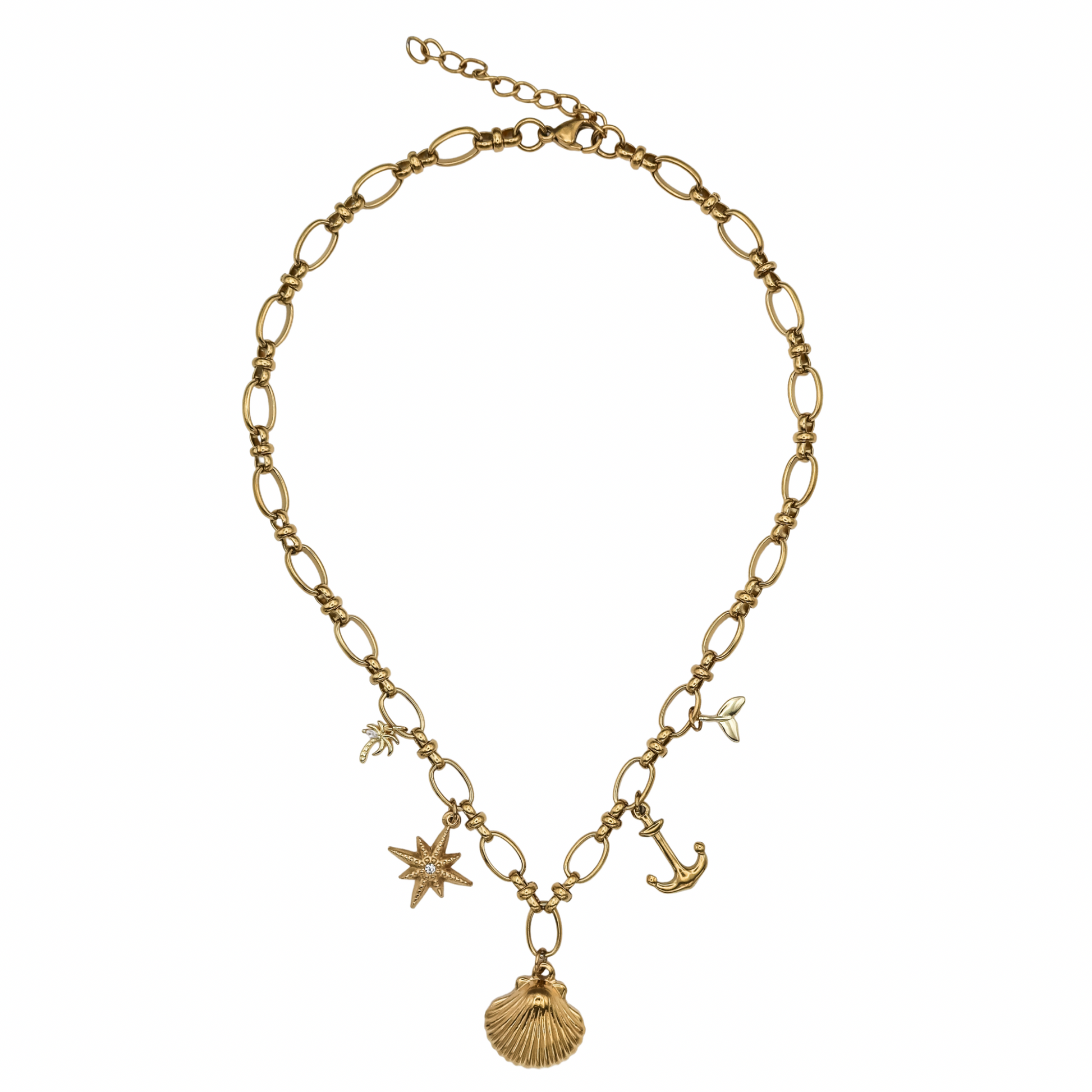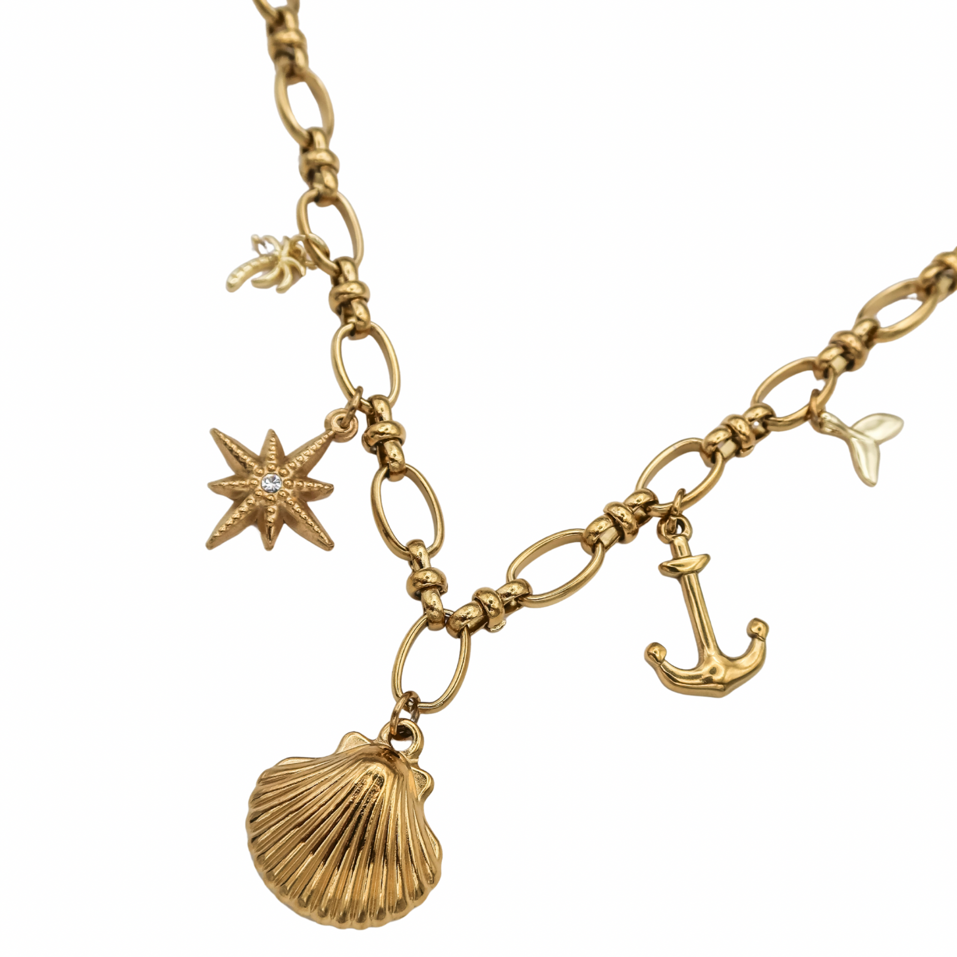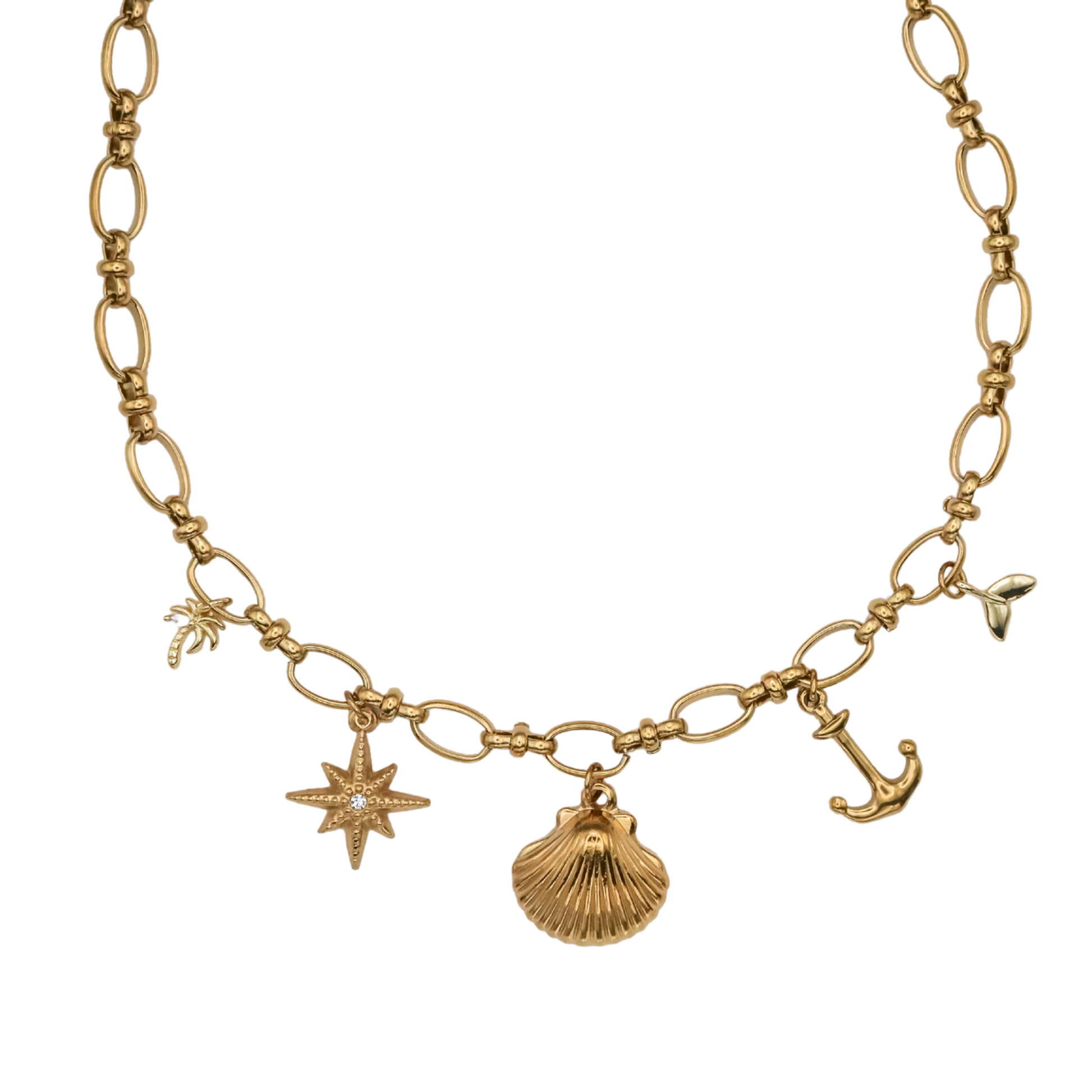 Set sail in style with this ocean-inspired charm necklace — a golden tribute to salty air, sun-soaked days, and your wild, adventurous heart. Crafted with a 16” + 2” extender circle charm chain in 18K Gold PVD-coated stainless steel, this piece features five hand-selected charms that capture the spirit of the sea: a palm tree, textured compass star, seashell, anchor, and mermaid tail.