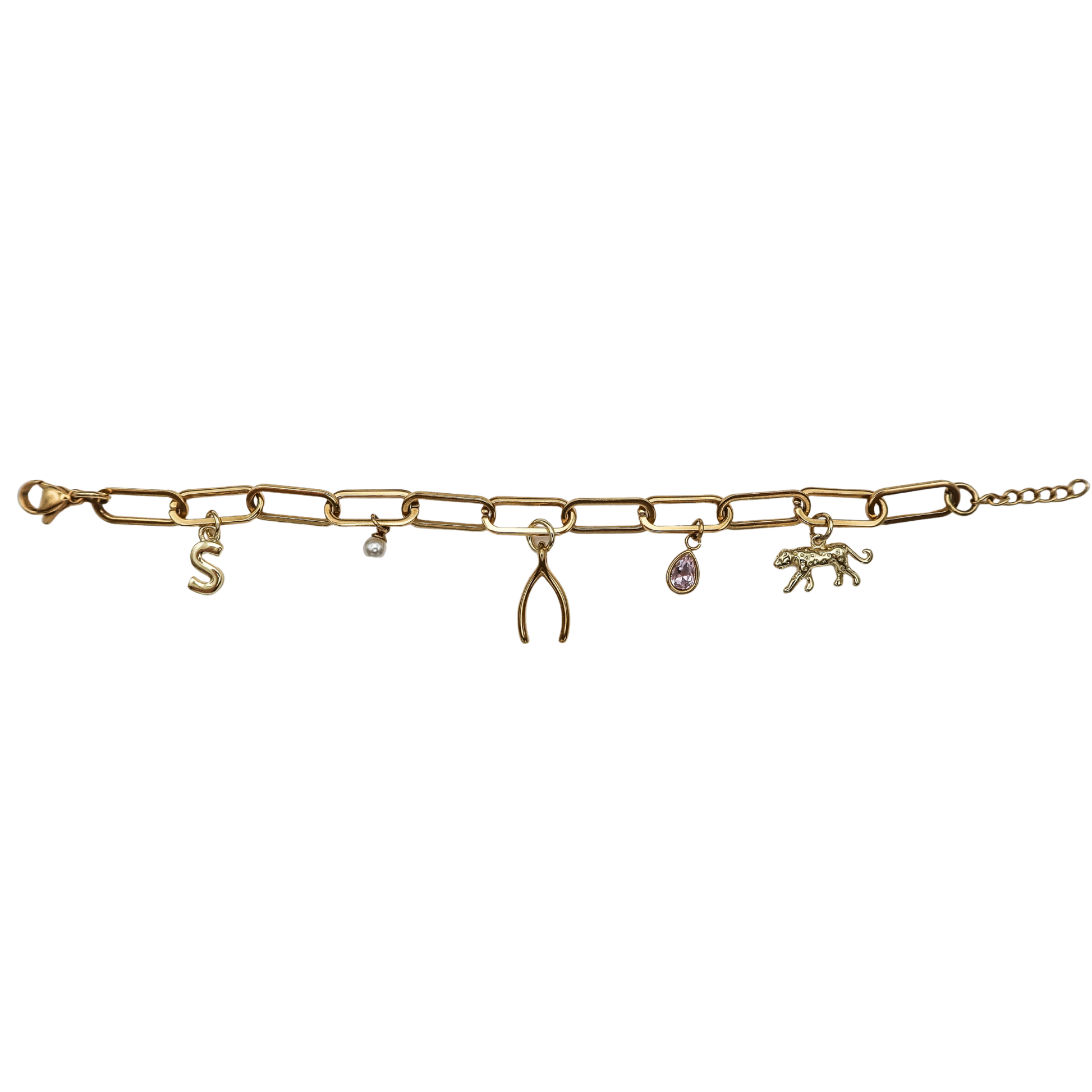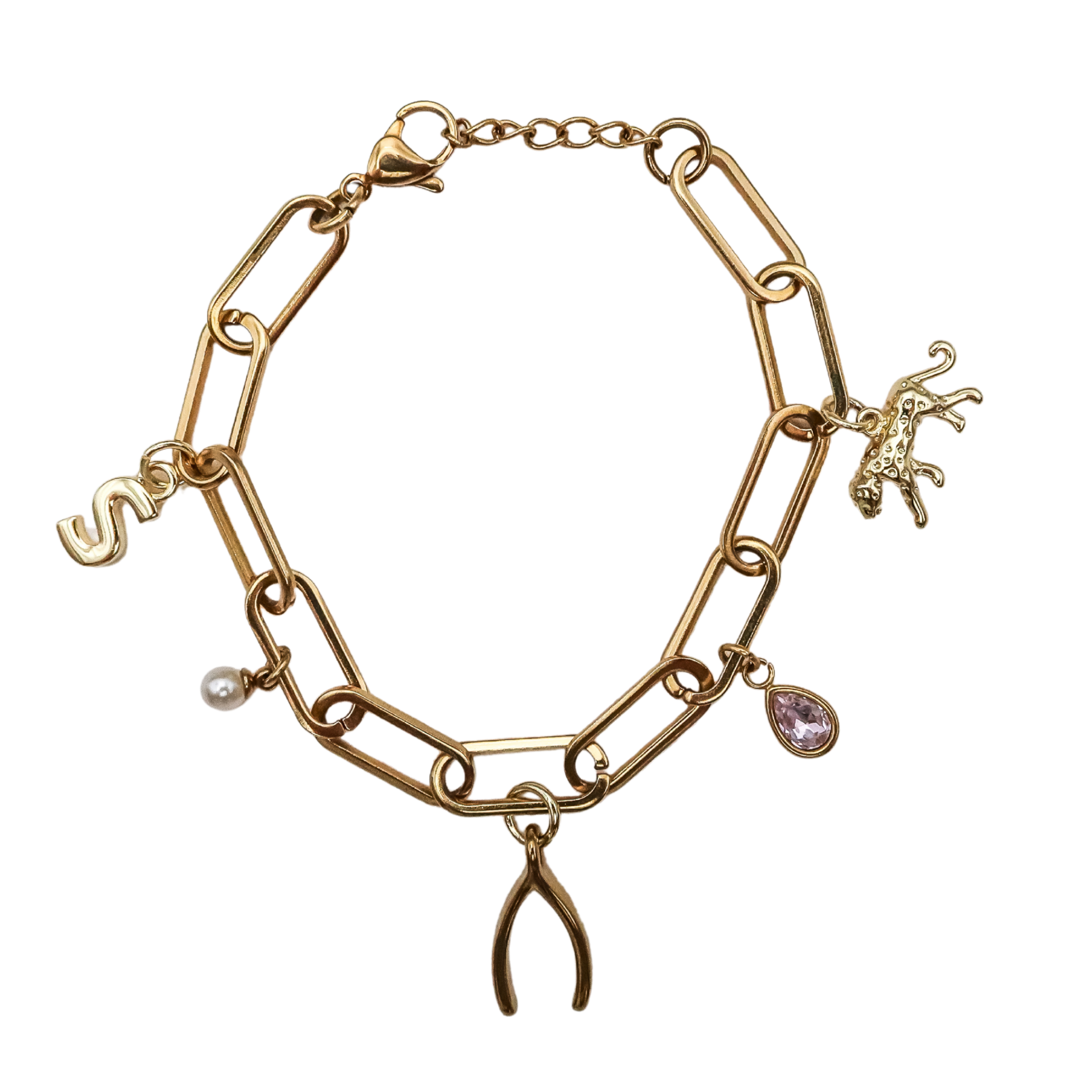 Bold, personal, and just the right amount of wild — this 6.5mm paperclip chain bracelet is crafted from 18K Gold PVD-coated stainless steel for a luxe look that’s built to last. Measuring 6.5" with a 1" extender, it’s adorned with a mix of meaningful and fierce charms: a custom initial, mini pearl, wishbone for luck, custom teardrop birthstone, and a sleek leopard to channel strength and confidence.