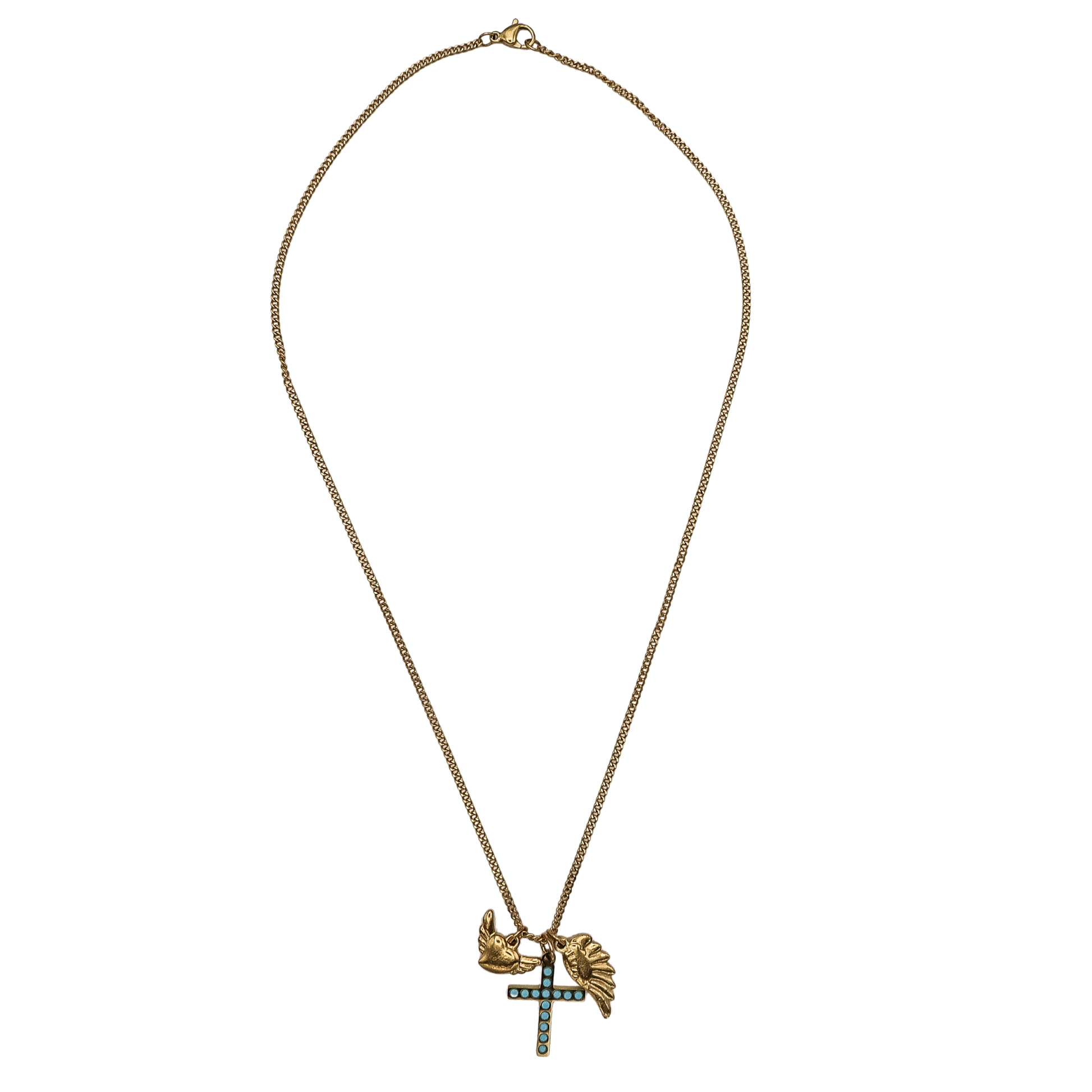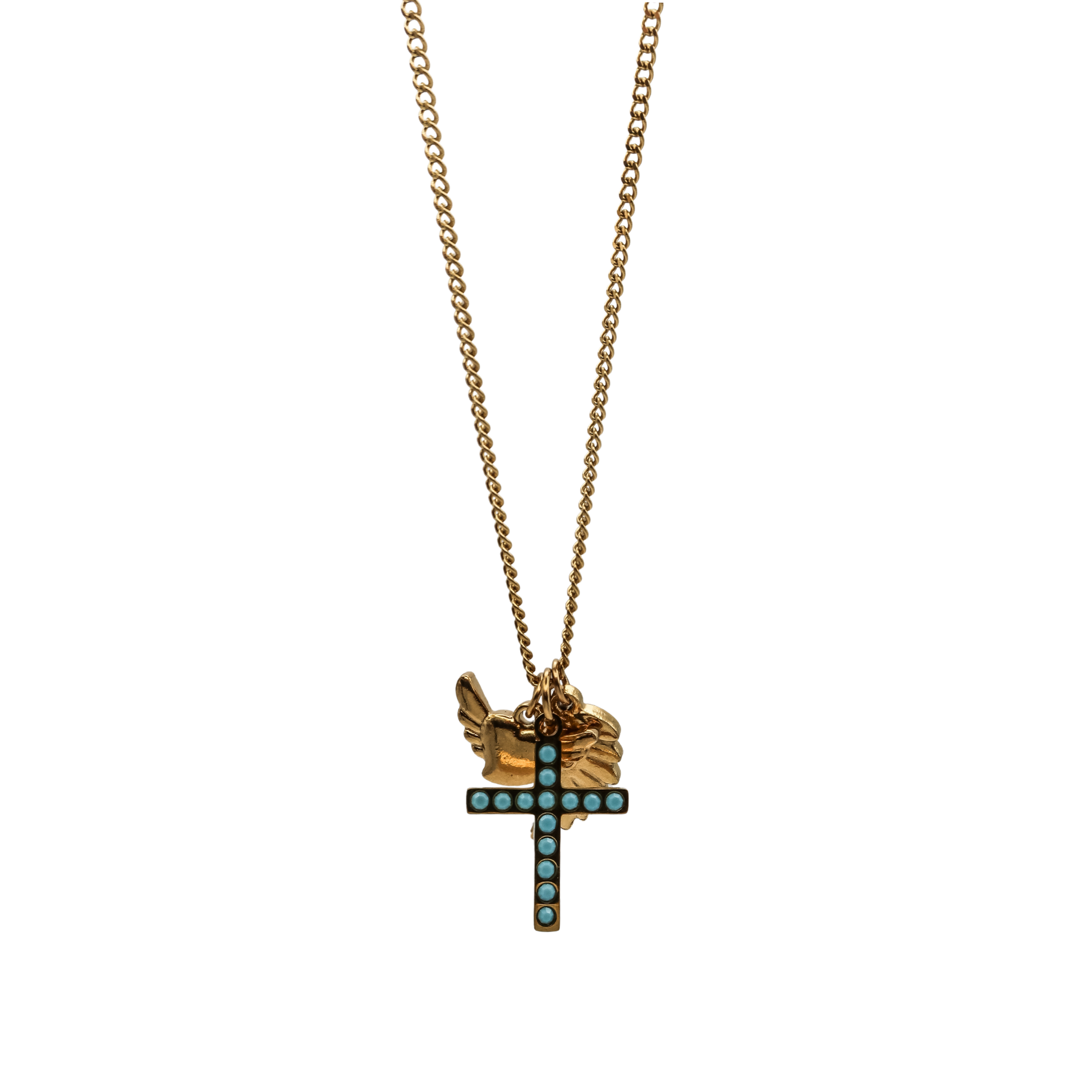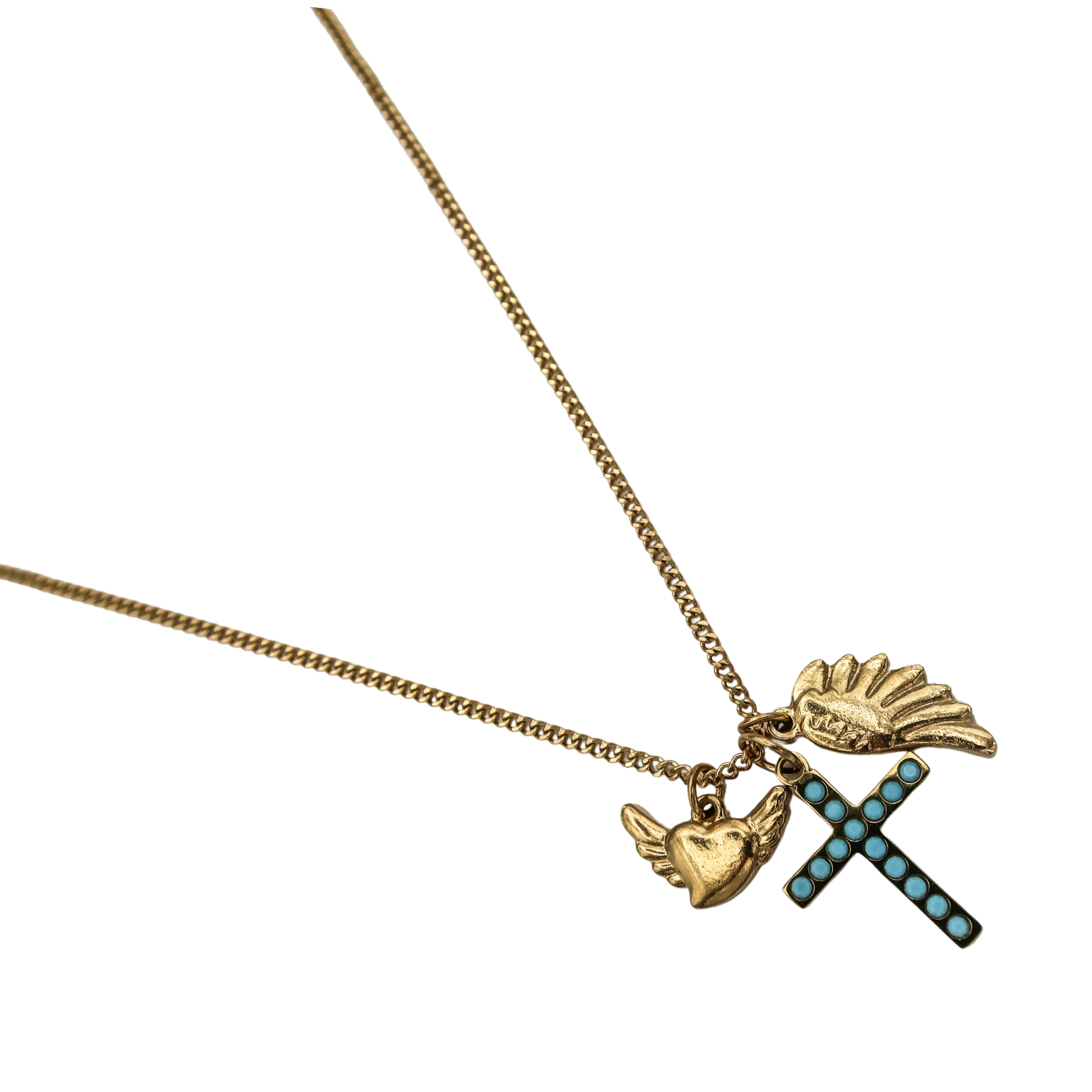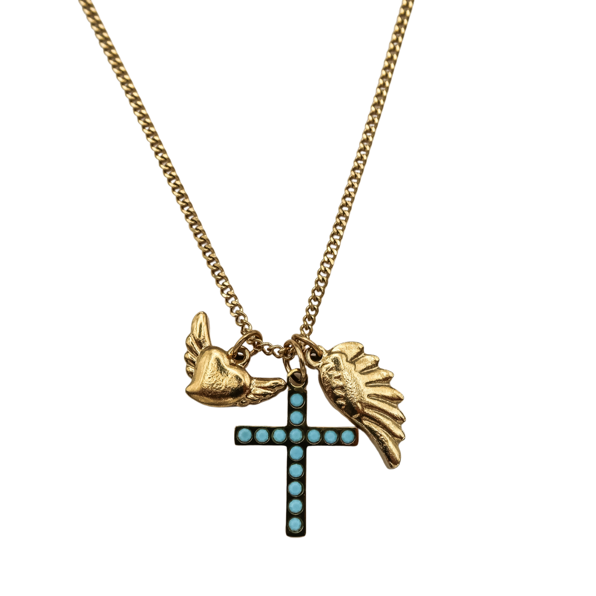 This radiant piece is a tribute to faith, freedom, and the beauty of transformation. Featuring a trio of meaningful charms — a heart with wings, a turquoise-studded cross, and a delicate wing — this necklace is a wearable reminder of love that lifts, protection that surrounds, and purpose that grounds.