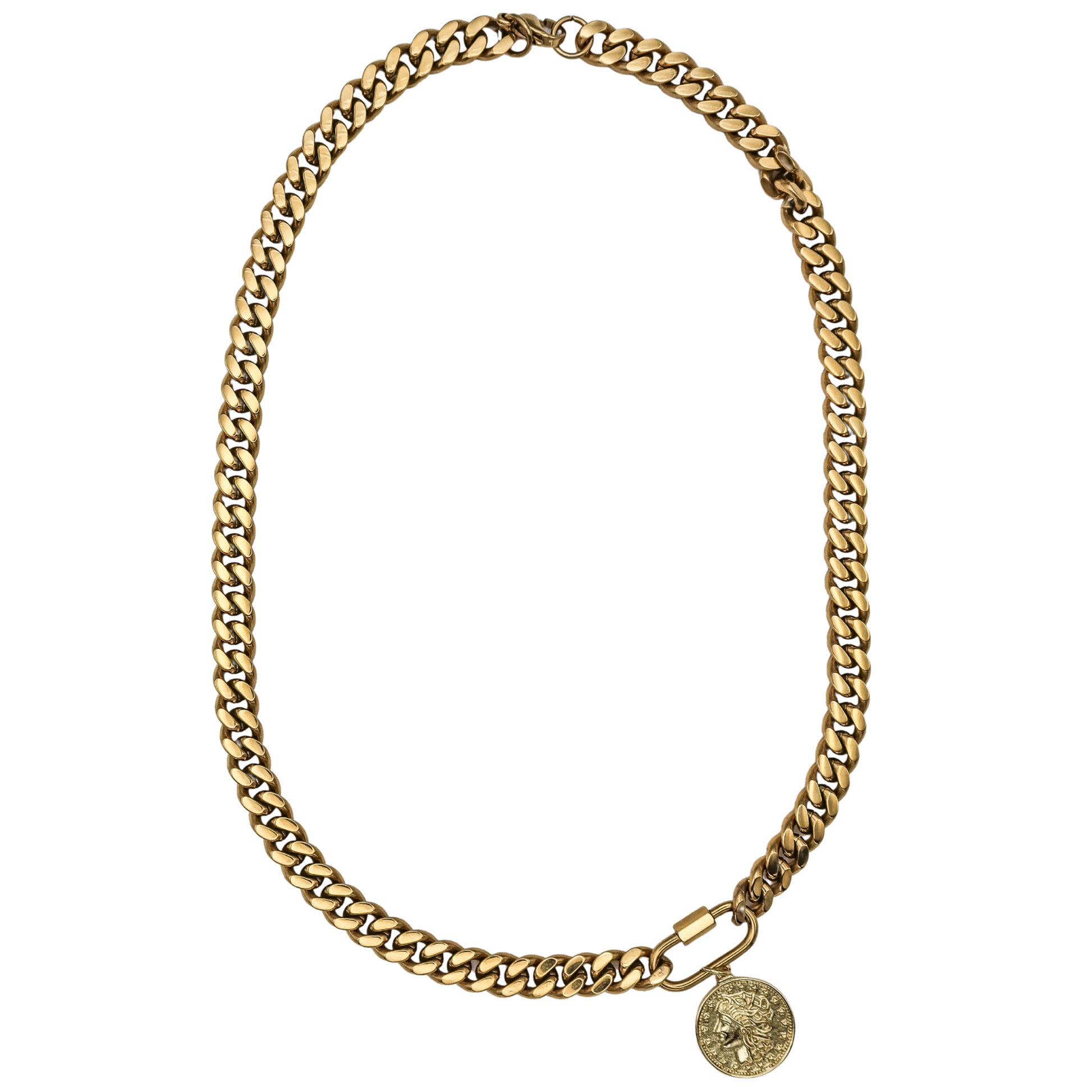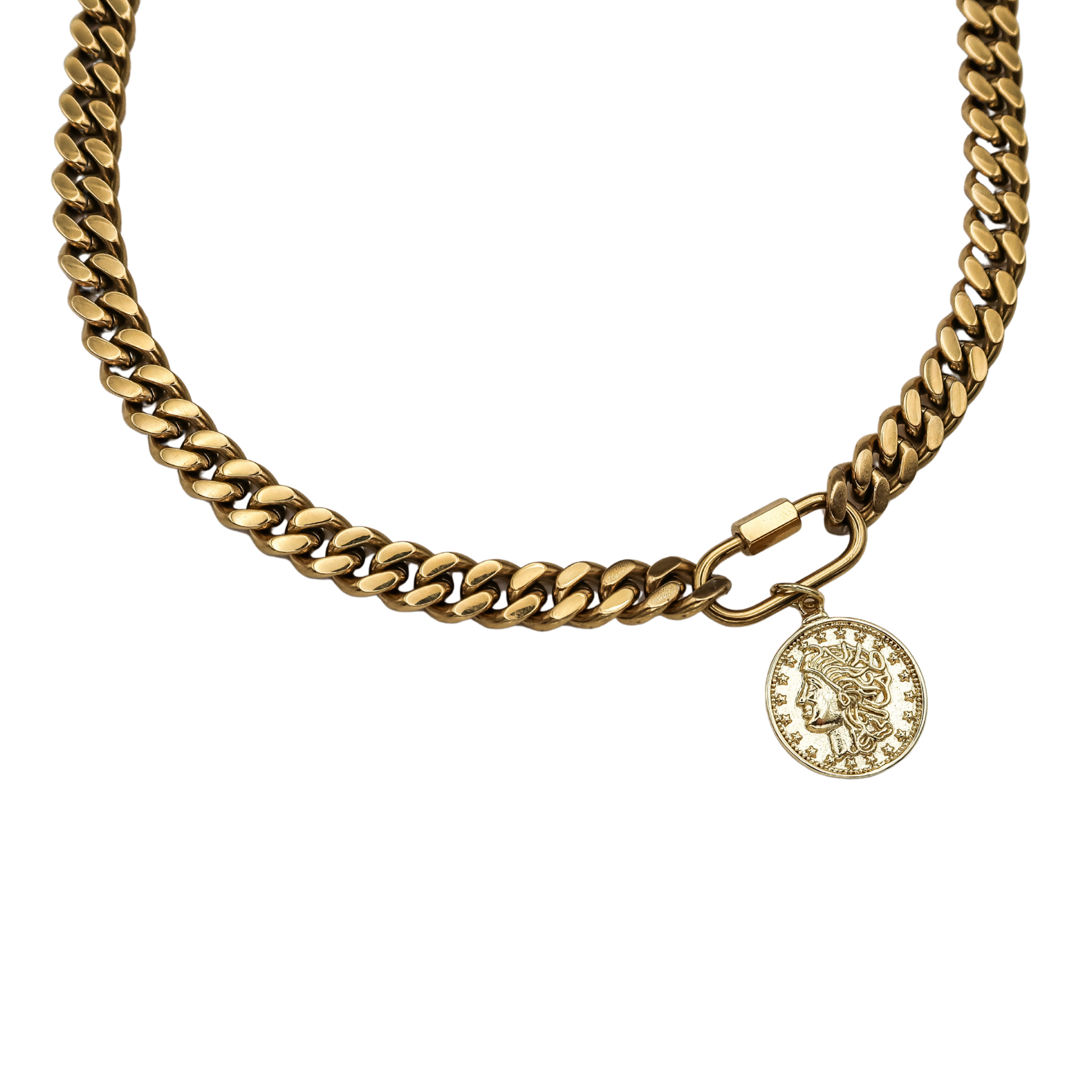 Bold and beautifully structured, this statement piece features an 8mm diamond-cut curb chain in 18K Gold PVD-coated stainless steel, paired with a sleek classic carabiner clasp and finished with a timeless 18K gold filled round coin charm. The oversized chain adds a luxe edge, while the carabiner detail brings a modern, utilitarian twist to this elevated everyday look.