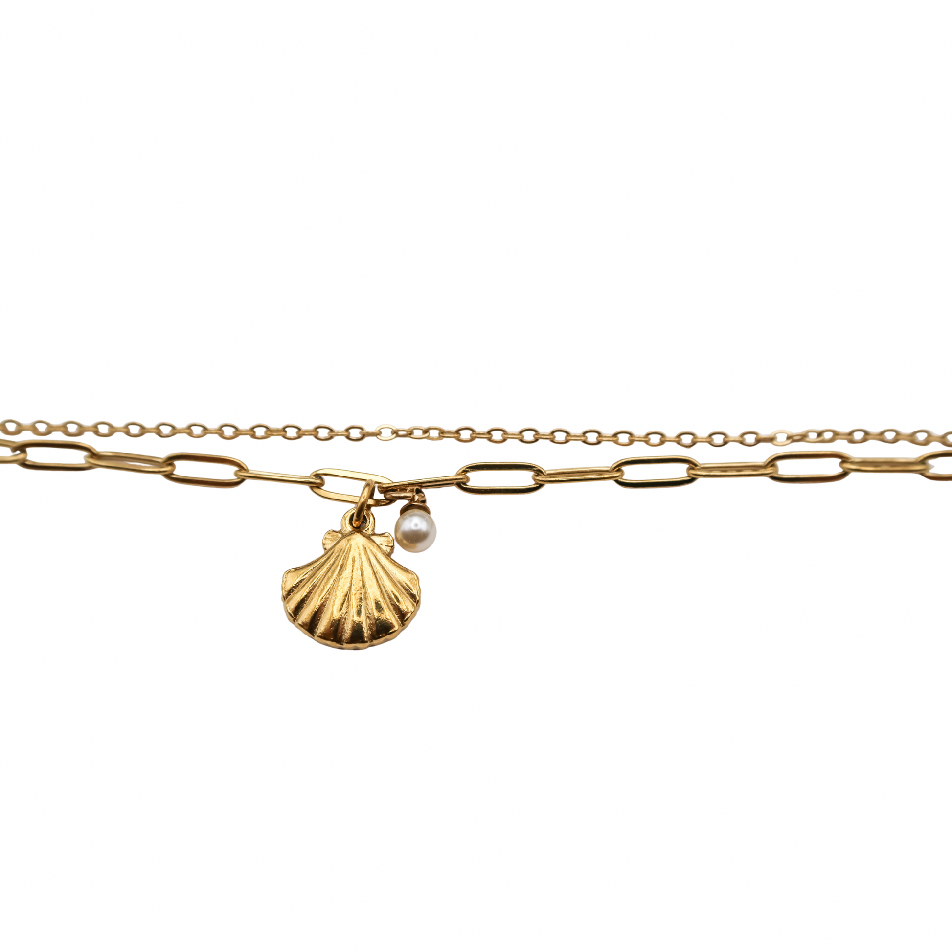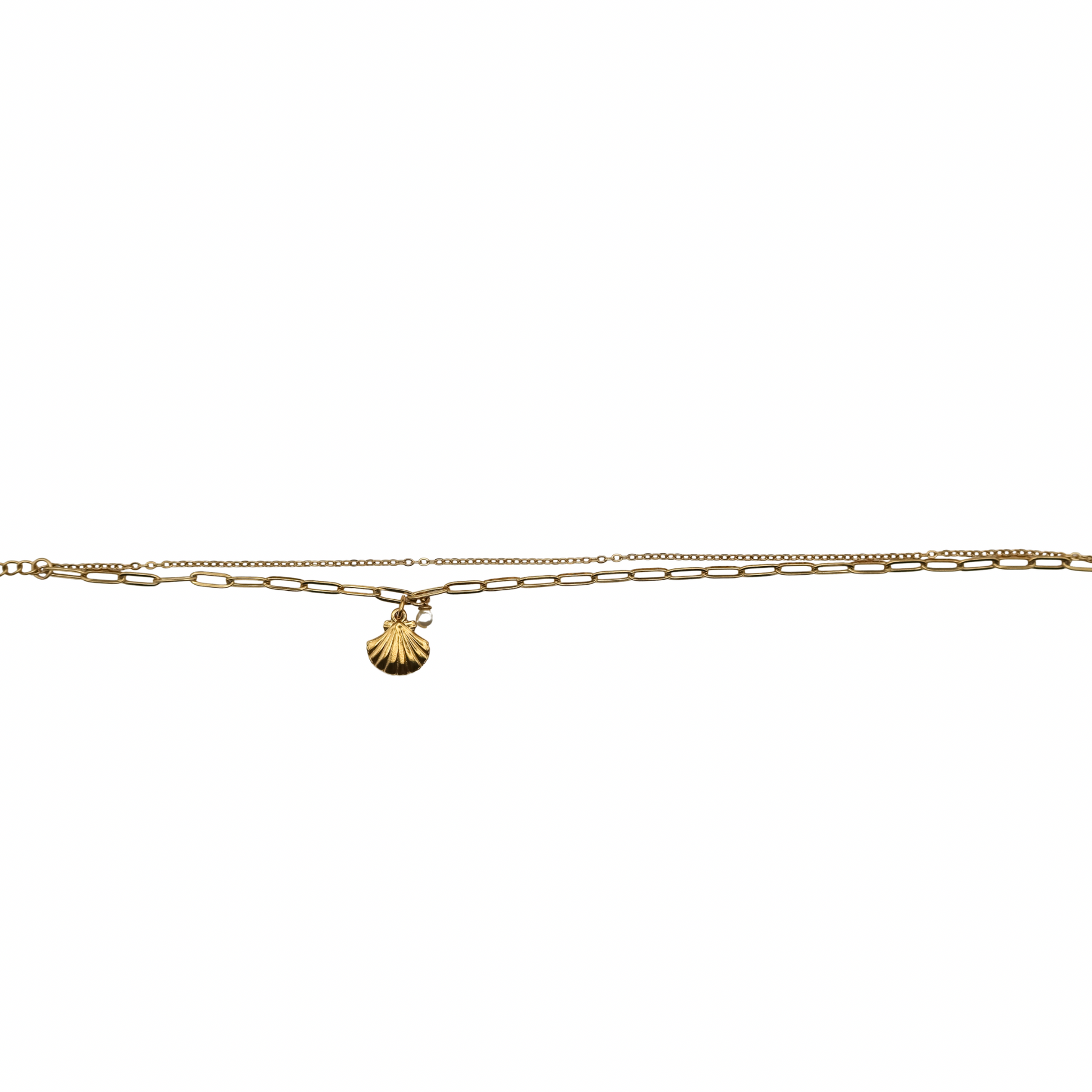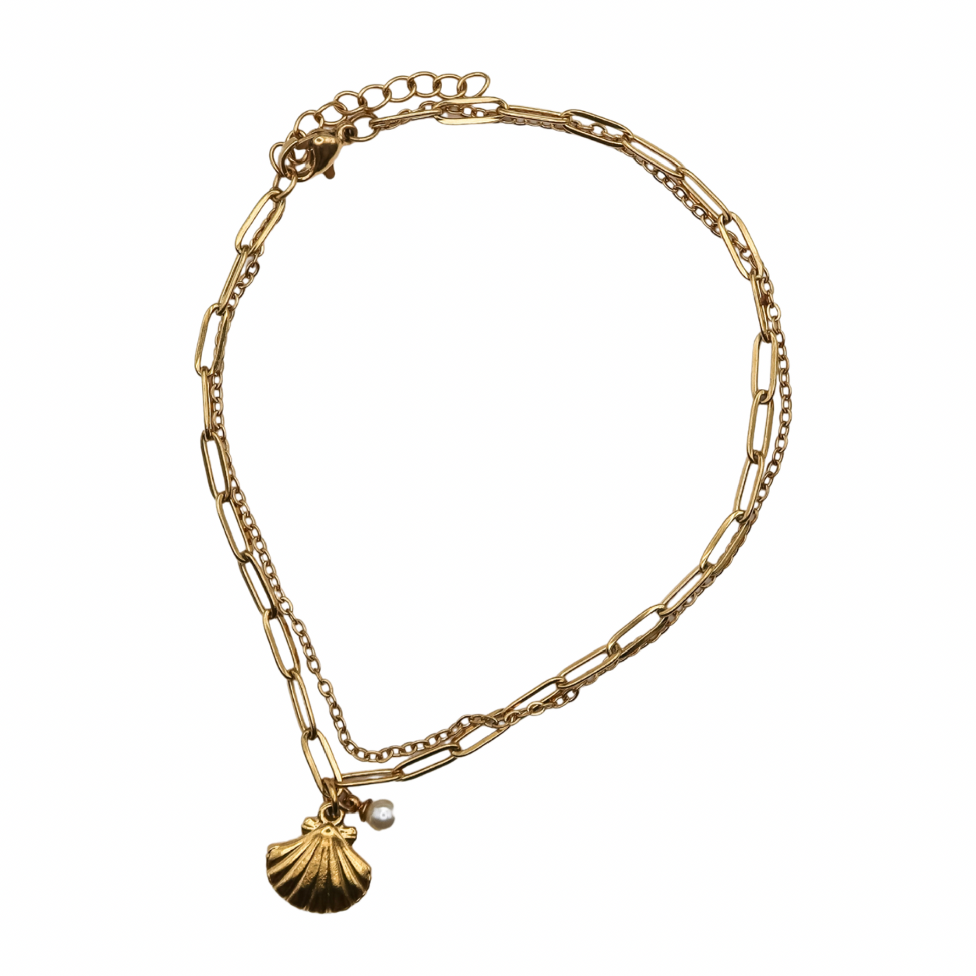 A dainty nod to the sea, this layered anklet pairs classic shine with coastal charm. Featuring a double chain design — one loop chain, one paperclip chain — in 18K Gold PVD-coated stainless steel, it’s finished with a mini gold shell and a mini glass pearl that sway softly with every step. The 9" length with a 1" extender offers an adjustable fit that’s perfect for barefoot beach days or dressing up your favorite sandals.