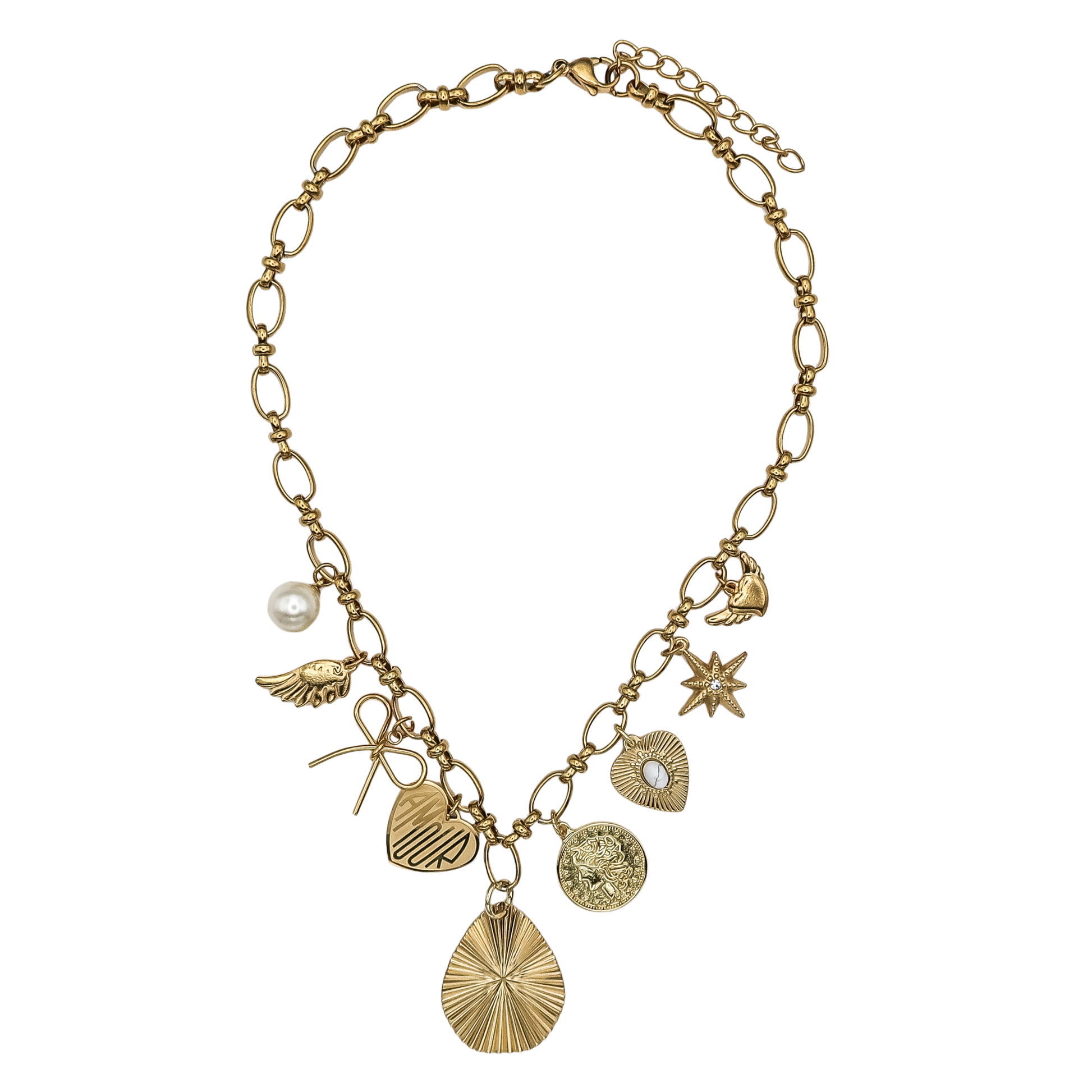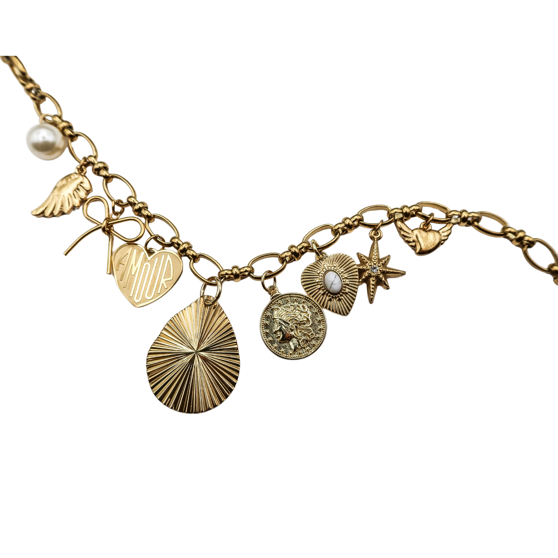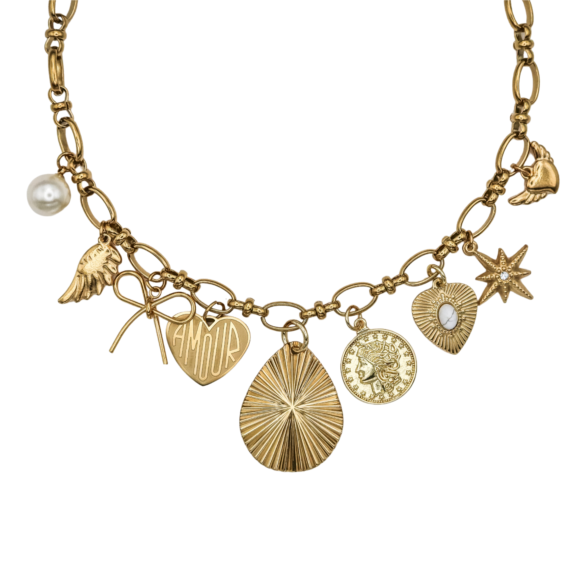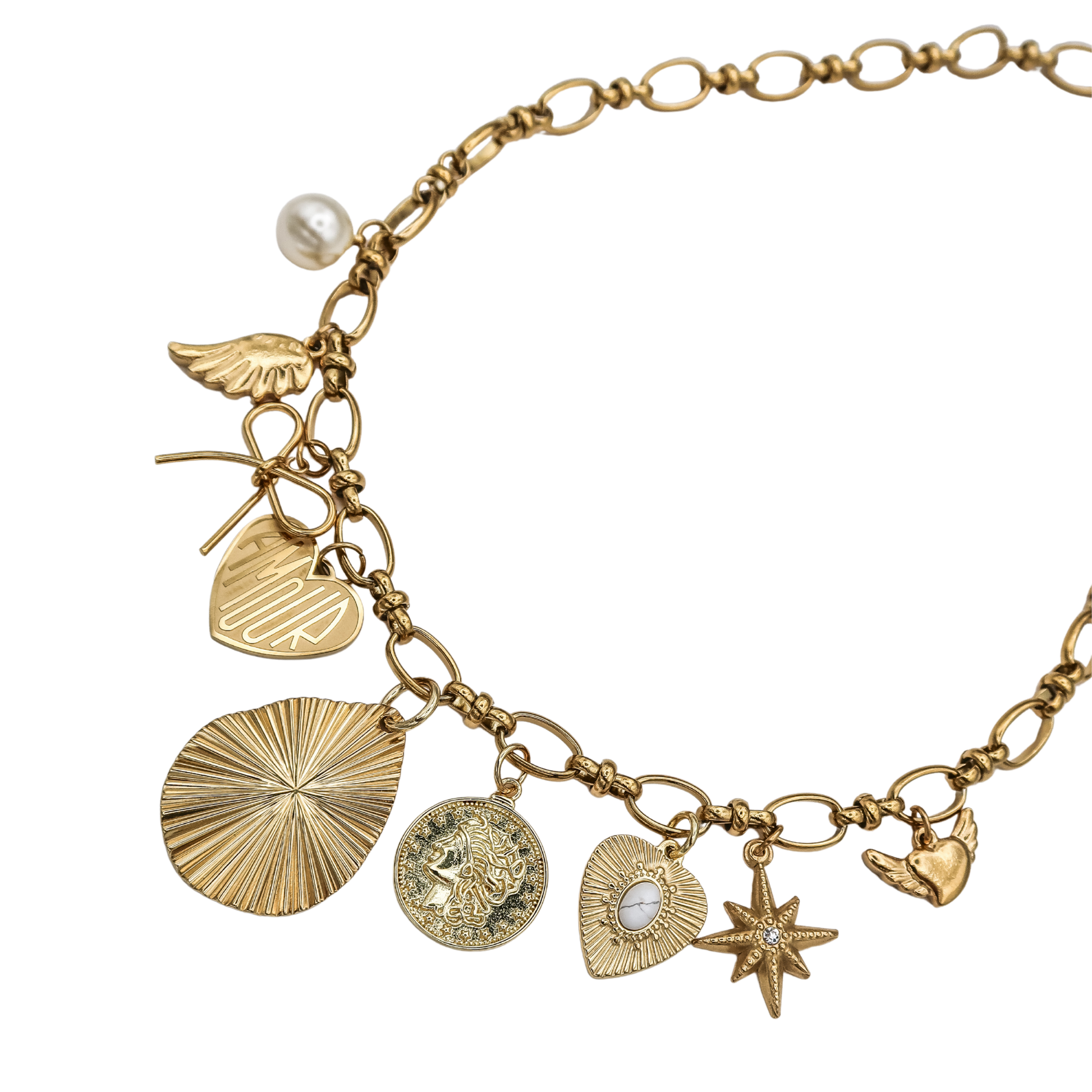 Adorned with a luminous glass pearl, angel wing, delicate bow, amour heart, textured sunburst teardrop, vintage-style gold coin, howlite heart, compass star, and a heart with wings, this piece feels like a miniature charm journal — personal, powerful, and made to shine.