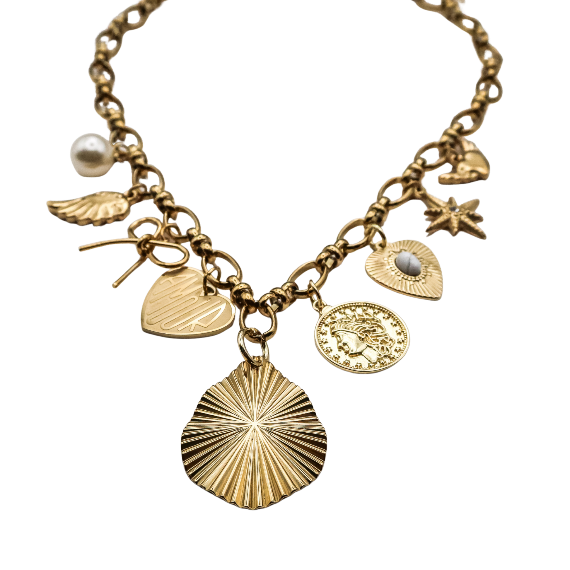 A dreamy blend of romance, meaning, and celestial magic. This 16” + 2” extender circle charm chain necklace in 18K Gold PVD-coated stainless steel carries a carefully curated collection of 9 symbolic charms — each one telling a story of love, light, direction, and strength.