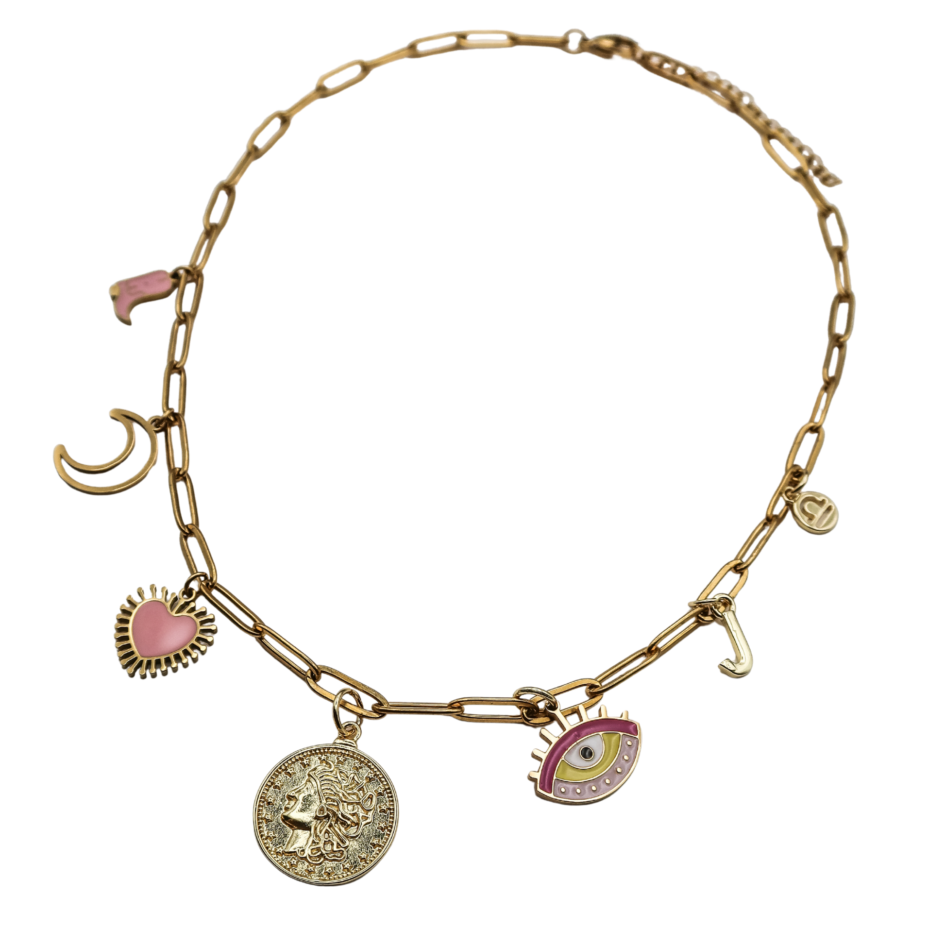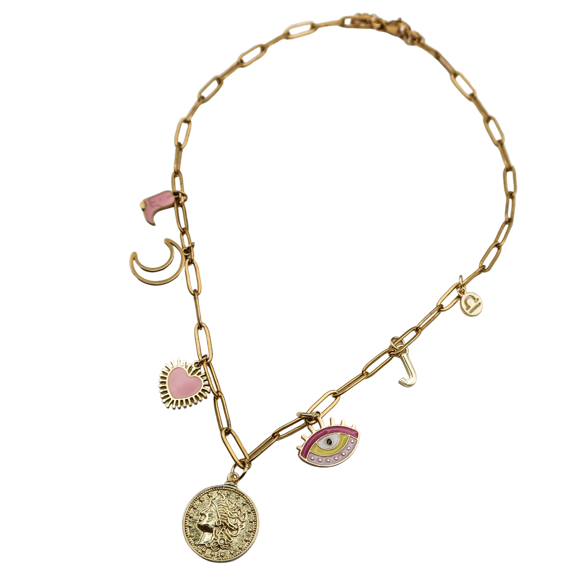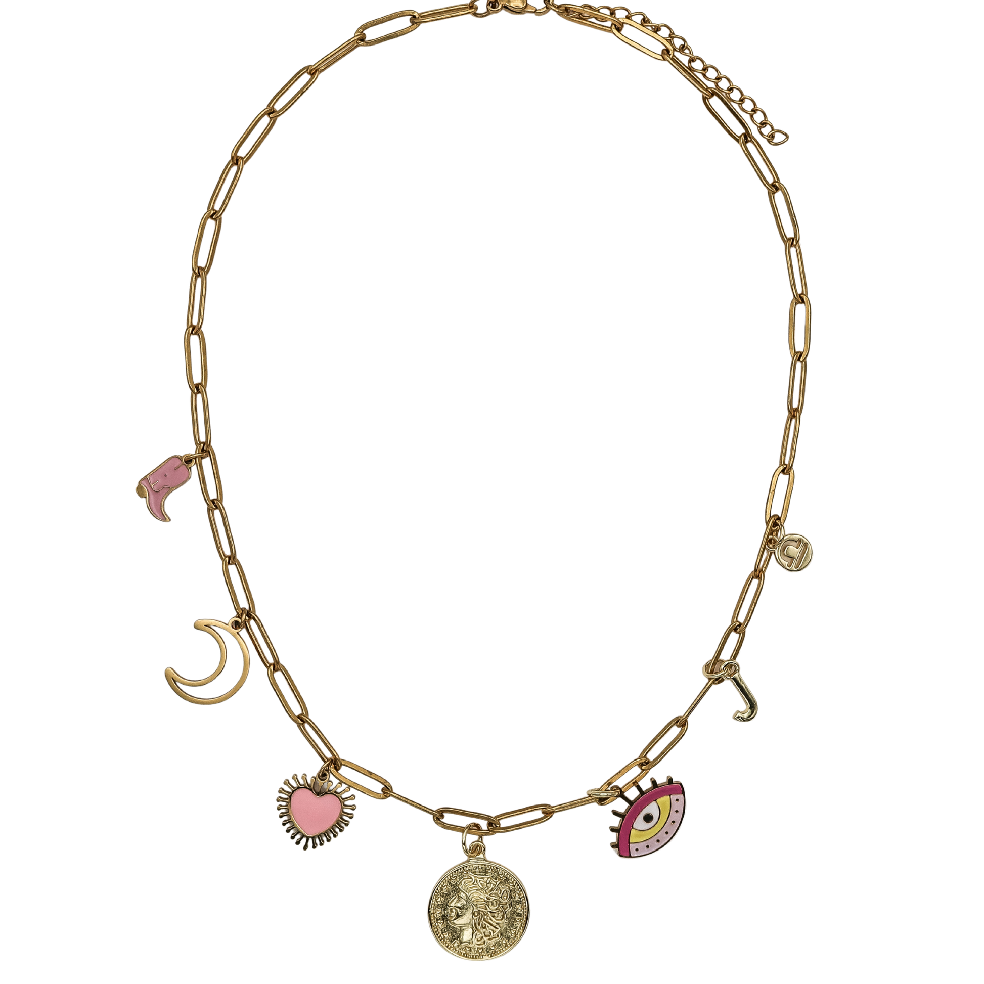 With pops of pink, celestial vibes, and meaningful symbols of love, luck, and identity, this necklace is your personality in gold — ready to layer, gift, or make your own everyday statement.
