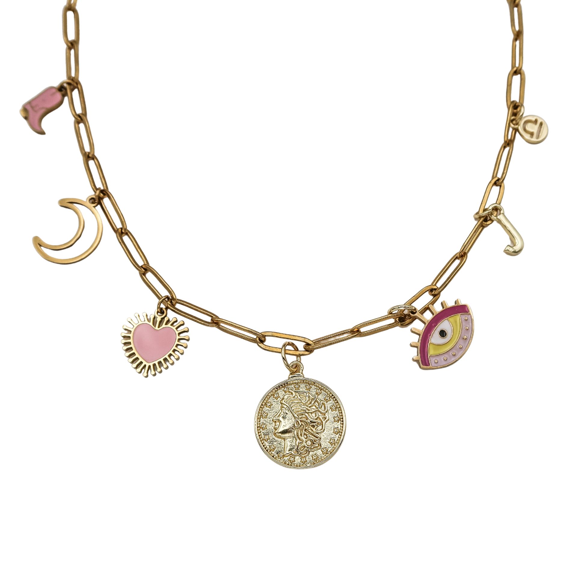 Playful and personalized charm necklace that’s anything but ordinary. Strung on a 6.5mm 18K Gold PVD-coated stainless steel paperclip chain, this piece features a curated cluster of charms that tell your story: a pink cowboy boot, crescent moon, pink heart, gold coin, pink evil eye, plus your custom initial and zodiac sign.